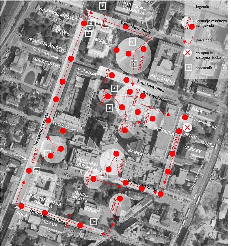 Hodi mesto je zvočni zemljevid v katerega gledalec vstopi in mu sledi s pomočjo aplikacije na mobilnem telefonu. Preko zvočnih slik, vtisnjenih v natančno izbrane lokacije v središču mesta, prehaja med fiktivnimi in realnimi situacijami. Zemljevid preplete zvok s prostorom in ga kot celoto ponudi v doživljanje izkušnje, v premislek.